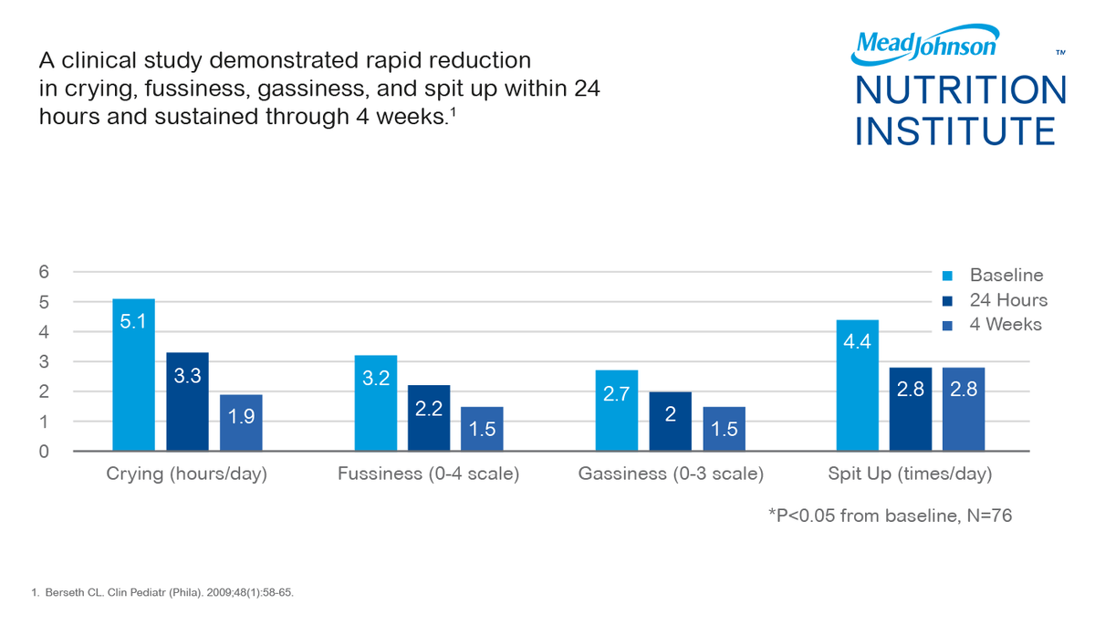 Research has shown that infant formula with partially hydrolyzed proteins and reduced levels of lactose can rapidly and effectively reduce digestive discomfort in infants. In a clinical study, rapid and effective reduction in crying, fussiness, gassiness, and spit up within 24 hours was demonstrated, with sustained improvements through 4 weeks.1