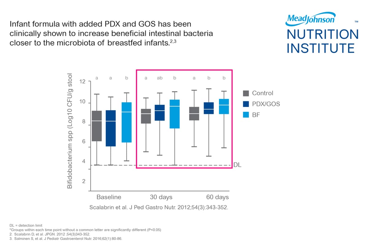 This data has also highlighted the importance of prebiotics, PDX and GOS, in supporting gut health. Infant formula with added PDX and GOS has been clinically shown to increase the number of beneficial intestinal bacteria closer to the microbiota of breastfed infants.2,3