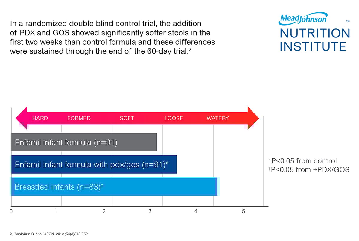 The addition of PDX and GOS in infant formula has been shown to significantly support softer stools in the first two weeks compared to control formula, with sustained effects through the end of a 60-day trial.2